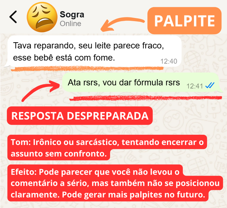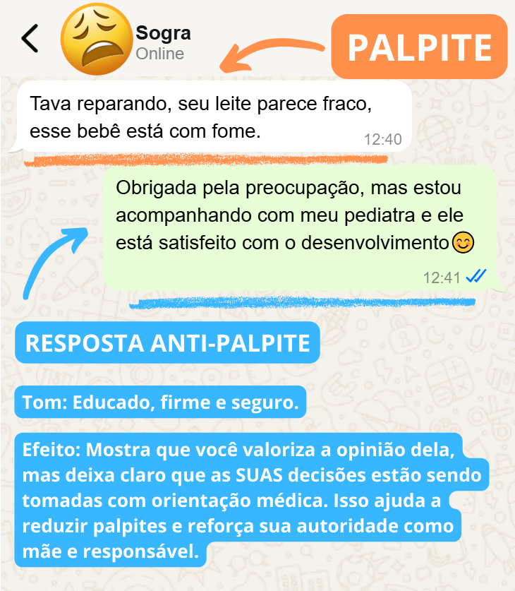 ✅ E até frases-resposta prontas para lidar com os palpites sem perder a calma (nem a confiança!).